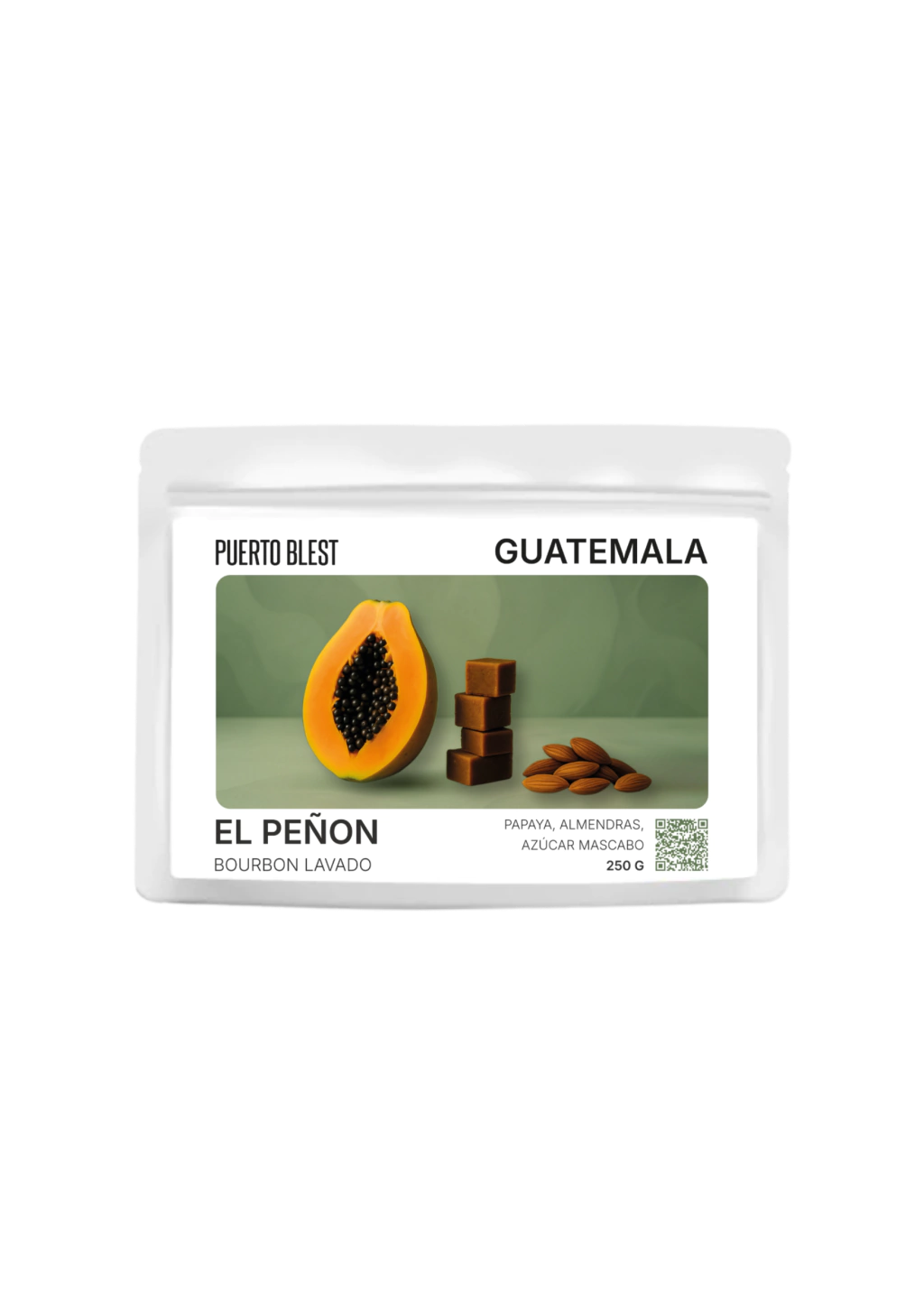 Este Bourbon lavado nace en la finca El Peñon, en la región de Huehuetenango, Guatemala, a 1600 metros de altura. Su fragancia es tropical y envolvente, con matices de miel, azúcar mascabo y frutas maduras. En taza, se expresa con un cuerpo sedoso y resbaladizo, acompañado de una acidez delicada que resalta su dulzura natural. Los sabores de papaya y durazno se entrelazan con notas de almendra y miel, creando una experiencia fresca y balanceada. El final es limpio, redondeado y prolongado, dejando una sensación armoniosa en boca.